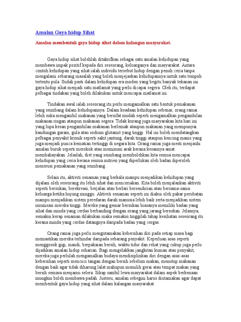 Dengan mengamalkan gaya hidup sihat kita dapat kekal cergas sihat dan menjauhkan diri daripada pelbagai penyakit. Karangan Gaya Hidup Sihat Satu Amalan Yang Murni. Amalan gaya hidup sihat memang banyak kepentingannya kepada manusia.